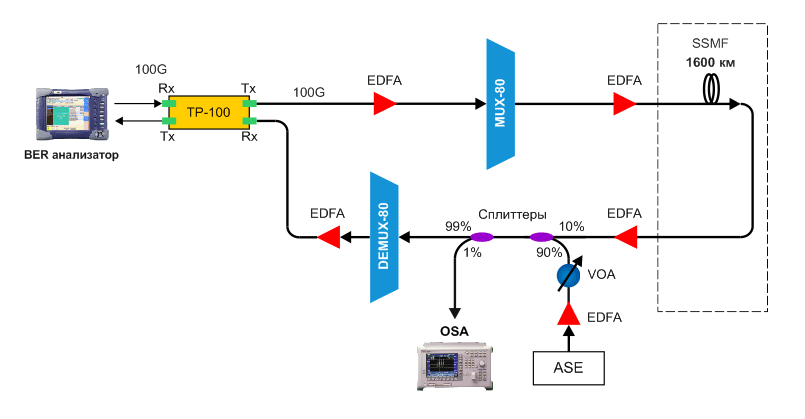 Данные передаются в линию в формате OTN OTU4 с использованием алгоритмов коррекции ошибок Soft-FEC/Super-FEC G.975 I.7. Передача данных осуществляется на стабилизированной длине волны в соответствии с частотной сеткой DWDM. Перестраиваемый по длине волны лазер позволяет организовывать в C-диапазоне до 88 DWDM-каналов с шагом 50 ГГц. Проведенные испытания показали отличное значение OSNRt, которое составило 12,5 дБ, что значительно превосходит показатели аналогичного оборудования других производителей.